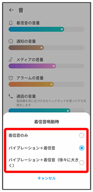| 着信音フェードイン | 着信音の音量をだんだん大きくさせるかどうかを設定します。 |