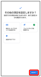 - モバイルネットワークを使用して初期設定を行うときは、セットアップ時にモバイル ネットワークを使用するを選択します。以降は、画面に従って操作してください。