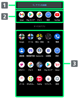 本機のおもな操作は「ホーム画面」と、アプリを一覧表示した「アプリ一覧画面」から行います。ホーム画面を上にフリックするとアプリ一覧画面が表示され、アプリを起動したり、本機の設定変更などを行ったりすることができます(ほかのホーム画面アプリを使用してホーム画面を変更することもできます)。