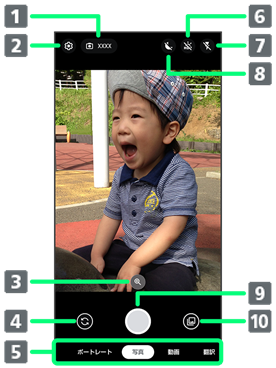 | 2 | インカメラの場合は、顔写真加工機能のオン/オフの切り替えができます。 |
