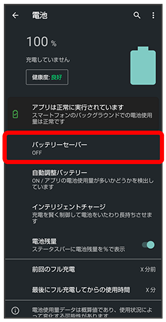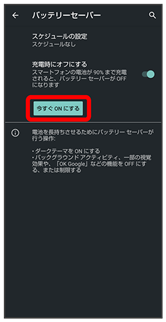 - 充電を開始すると今すぐ ON にするに切り替わり、バッテリーセーバーが自動的に無効になります。