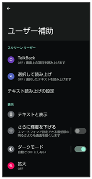 | スクリーンリーダー | TalkBack(画面上の項目を読み上げ)、選択して読み上げなどが追加されます。 | |