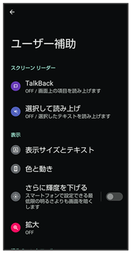 | 表示 | テキストと表示の一部の項目が表示サイズとテキストとして追加されます。 詳しくは、「ディスプレイの設定について」を参照してください。 テキストと表示の一部の項目が色と動きとして追加され、ダークモードが移動されます。 拡大に入力しながら拡大が追加され、文字の入力に合わせて拡大範囲を移動させるかどうかを設定できます。 そのほかの項目が一部変更されます。 |