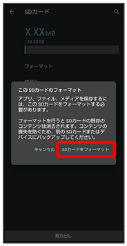 フォーマットすると、microSDXCカード内のデータはすべて消去され、異なるファイルシステムに書き換えられ、本来の容量で使用できなくなることがあります。データが破損したmicroSDXCカードの再使用にあたっては、SDXC規格対応機器での再フォーマットが必要です。