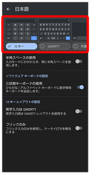 本機の文字入力は、画面に表示されるソフトウェアキーボードで行います。ソフトウェアキーボード(Gboard)には、1つのキーに複数の文字が割り当てられている「12 キー」と、1つのキーに1つの文字が割り当てられている「QWERTY」などがあります。