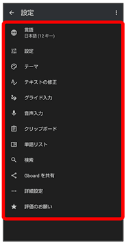 Gboardに関する動作を設定できます。設定できる項目は次のとおりです。