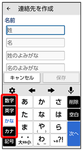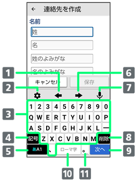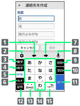 - 文字入力モードを切り替えます(数字/英字/かな/カナ)。