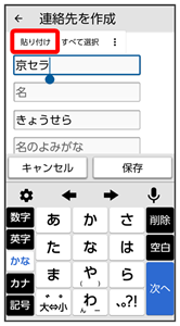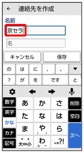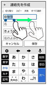テンキーで入力するとき、キーを上下左右にフリックすることで、キーを繰り返しタップすることなく、入力したい文字を入力できます。キーに触れると、フリック入力で入力できる候補が表示されます。入力したい文字が表示されている方向にフリックすると、文字が入力されます。