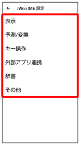 | その他 | ・学習辞書リセット 学習辞書をリセットできます。 ・設定リセット すべての設定を初期化します。 ・オープンソースライセンス オープンソースライセンスを確認できます。 ・iWnn IME iWnn IMEのバージョンを確認できます。 |