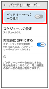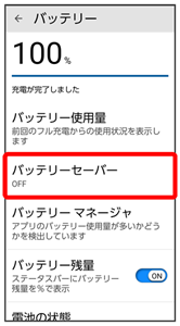 になります。 - 充電時に OFF にするをタップすると、電池残量に応じてバッテリーセーバーをOFFに設定することができます。