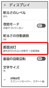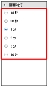 | 画面消灯 | 一定時間操作をしなかったときに、画面が自動消灯するまでの時間を設定します。 | |