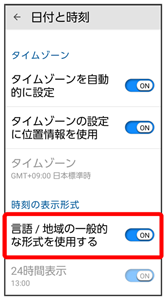 )が切り替わります。 - 言語/地域の一般的な形式を使用するがOFFの場合は、24時間表示をタップするたびに、24時間表示(