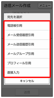 • ↓電話帳引用メール受信履歴引用メール送信履歴引用メールグループ引用プロフィール引用直接入力