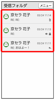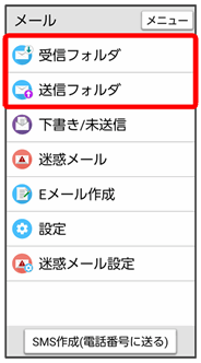 迷惑メール設定を行うと、電話帳に登録していない差出人から受信したメールは、新着メール通知されず、迷惑メールフォルダに保存されます。迷惑メールフォルダに保存されたメールは、次の操作で確認できます。
