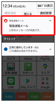 緊急速報メール受信メッセージ一覧画面が表示されます。