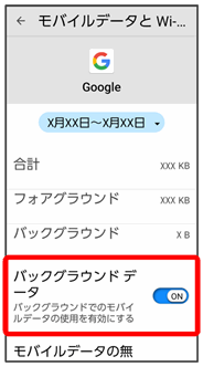 | バックグラウンドデータの通信 | バックグラウンドデータの通信を制限します。詳しくは、「バックグラウンドのモバイルデータ通信を制限する」を参照してください。 | |