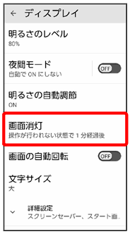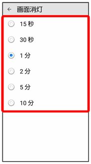| 画面消灯 | 一定時間操作をしなかったときに、画面が自動消灯するまでの時間を設定します。 | |