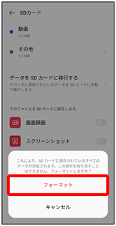 - フォーマットすると、SDカード内のデータがすべて消去されます。ほかの機器で使用したSDカードをフォーマットするときは、あらかじめよくご確認のうえ、操作してください。