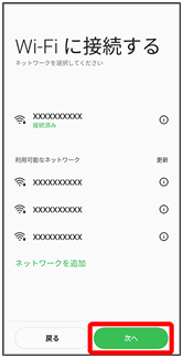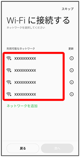 - Wi-Fiネットワークを設定しないときは、スキップをタップします。以降は、画面の指示に従って操作してください。