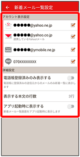 - 新着メール一覧設定画面でアプリ起動時に表示する