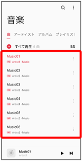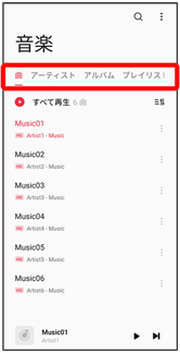 - アーティスト/アルバムをタップすると、アーティスト/アルバム名が一覧で表示されます。アーティスト/アルバム名をタップしてから、曲名をタップすると曲が再生されます。