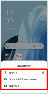 - 充電のみ/ファイルを転送/Android Auto/写真を転送