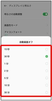 | 自動画面オフ | 操作を行わなかった場合に画面消灯する時間を設定します。 | |