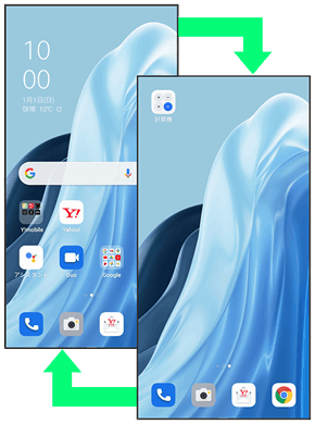 本機を横向きに回転させると、表示画面も横表示に切り替わります。