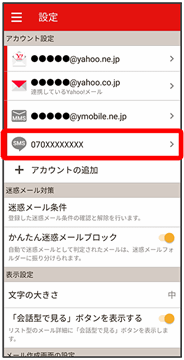 • ↓Y!mobile メール設定画面で、SMSのアカウントをタップ