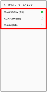 • お買い上げ時は5G/4G/3G/GSM(自動)に設定されています。日本国内や3Gネットワークの通信事業者のみの地域で本機を使用する場合は設定を変更する必要はありません。