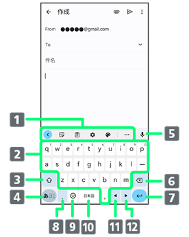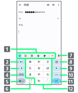 - 文字入力モードを切り替えます(かな/英字/数字)。ロングタッチすると文字入力の設定画面を表示したり、片手モードを設定したりできます。