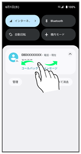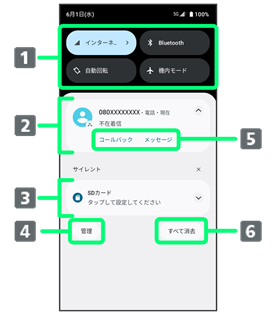 | 1 | 通知によって利用できる機能は異なります。たとえば着信の通知では、着信のあった電話番号に発信したり、SMSを送信できます。 |