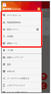- すべてのメール/電話帳登録済み/指定ドメイン/未登録/迷惑メール