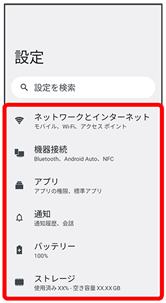 ネットワークとインターネット Wi-Fiやモバイルデータ通信など、ネットワークやインターネットに関する設定ができます。