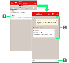 会話型表示では、宛先ごとに送受信したメールをまとめて表示します。たとえば、山本さんとやりとりしたメールを確認するときは、1つのスレッドの中で山本さんと会話をしているように表示されます。
