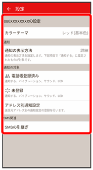 | 未登録 | 電話帳に未登録の相手からメールを受信したときの通知方法を設定します。 | |