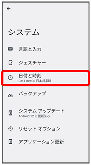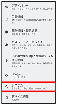 言語と入力やジェスチャー、日付と時刻、バックアップ、リセット、システム アップデートなどに関しての確認や設定ができます。