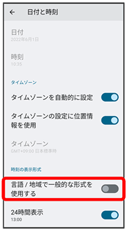 ユーザーの言語/地域の標準に従って24時間表示/12時間表示が自動設定されます。