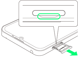 - ディスプレイを上にして、カードトレイを引き出してください。ディスプレイを下にしたり、本機を立てた状態でカードトレイを引き出すと、SIMカードやSDカードがカードトレイから外れ、紛失する可能性があります。