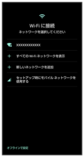 - モバイルネットワークを使用して初期設定を行うときは、セットアップ時にモバイル ネットワークを使用するを選択します。以降は、画面に従って操作してください。
