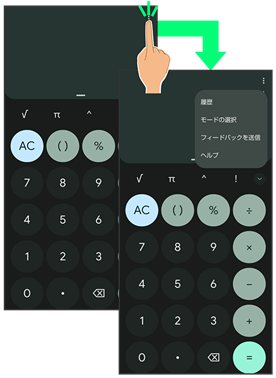 をタップすると、その画面で利用できる機能の設定や項目が画面に表示されます。