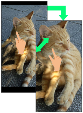 2本の指で画面に触れ、指を開いたり(ピンチアウト)、閉じたり(ピンチイン)します。