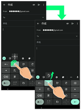 - キーをロングタッチすると、キー入力ガイドがポップアップで表示されます。キーをタップしたまま入力する文字の方向へフリックし、入力します。