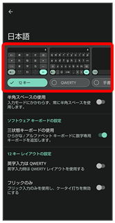 本機の文字入力は、画面に表示されるソフトウェアキーボードで行います。ソフトウェアキーボード(Gboard)には、1つのキーに複数の文字が割り当てられている「12 キー」と、1つのキーに1つの文字が割り当てられている「QWERTY」などがあります。