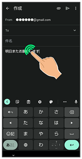 をタップしたあと、次の文字を入力します。入力した文字の背景色が変わったあとは、そのまま次の文字が入力できます。 - キーをくり返しタップせず、キーをロングタッチしたときに表示されるキー入力ガイドを利用して文字を入力することもできます。詳しくは、「フリック入力について」を参照してください。