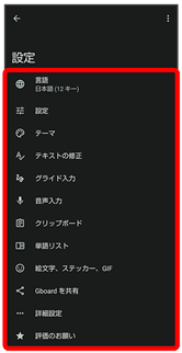 Gboardに関する動作を設定できます。設定できる項目は次のとおりです。
