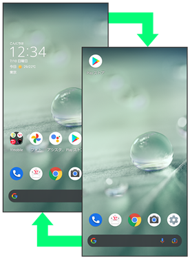 画面の自動回転を有効にしているときは、本機を横向きに回転させると、自動的に表示画面も横表示に切り替わります。詳しくは、「クイック設定パネルの見かた」、「ディスプレイ設定」、「ユーザー補助」を参照してください。