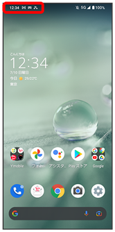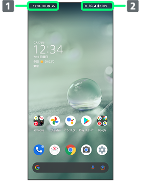 画面上部には、新着メールなどをお知らせする通知アイコンや、本機の状態を示すステータスアイコンが表示されます。