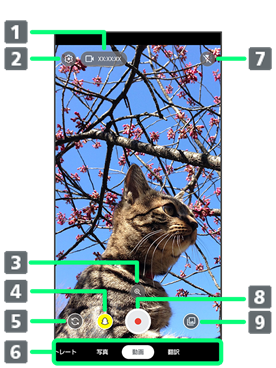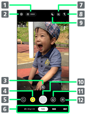 | 2 | インカメラの場合は、顔写真加工機能のオン/オフの切り替えができます。 |