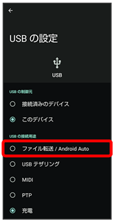 ファイル転送/Android Autoと操作してください。 - 使用後は、本機とパソコンからUSB Type-Cケーブルを取り外してください。